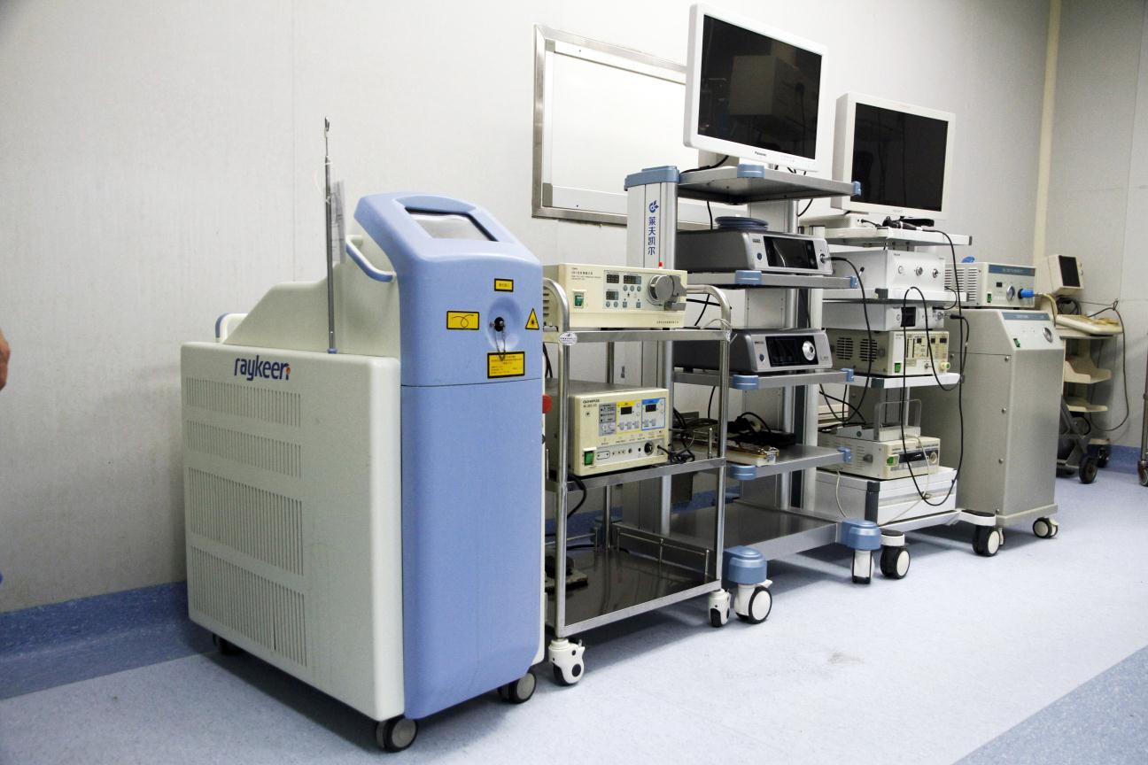 手麻科有层流手术室6间,麻醉恢复室1间,每间手术室均配备了先进的监测、抢救设备,麻醉机及麻醉药品,抢救药品保管完好,随时待用,骨科手术间有日本进口的C型臂骨动力系统(下图左),前列腺手术间配有先进的双波长激光机,弹道碎石机,钬激光碎石机(下图中)。腔镜手术室有3套进口电视腹腔镜,麻醉恢复室配备呼吸机(下图右),常规生命体征监测系统,抢救药品等。