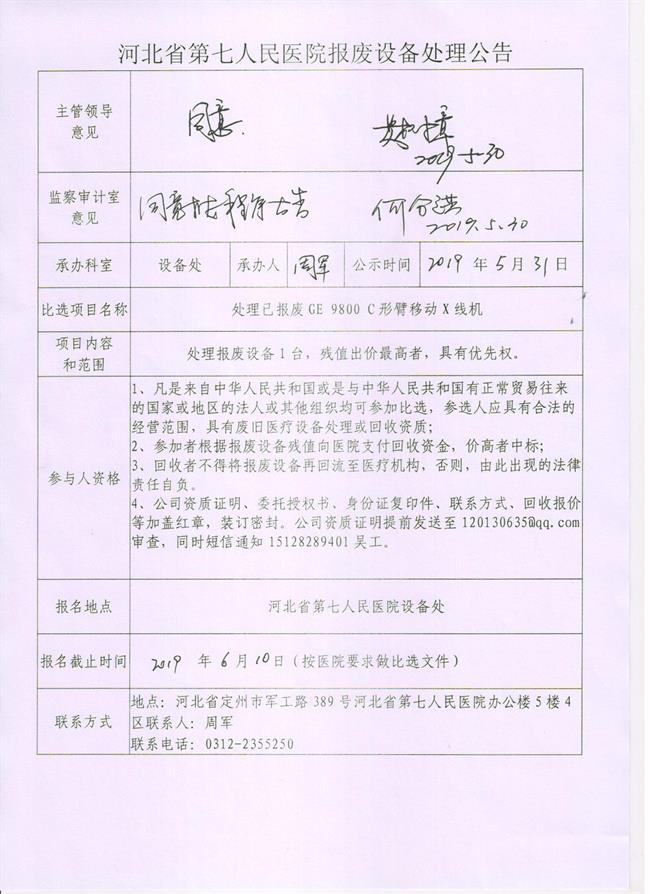 处理已报废GE9800C形臂移动X线机公告