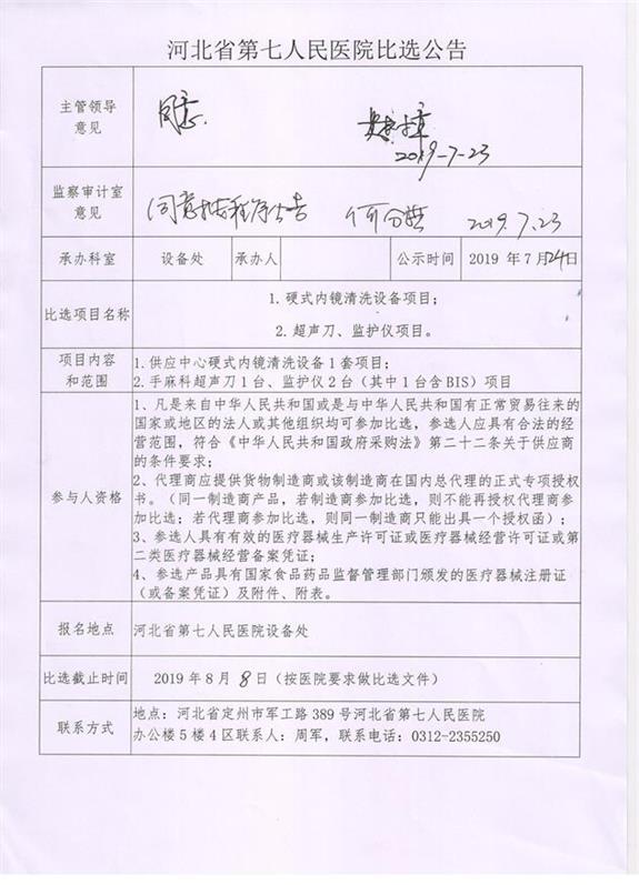 河北省第七人民医院硬式内镜清洗设备项目,超声刀、监护仪项目比选公告