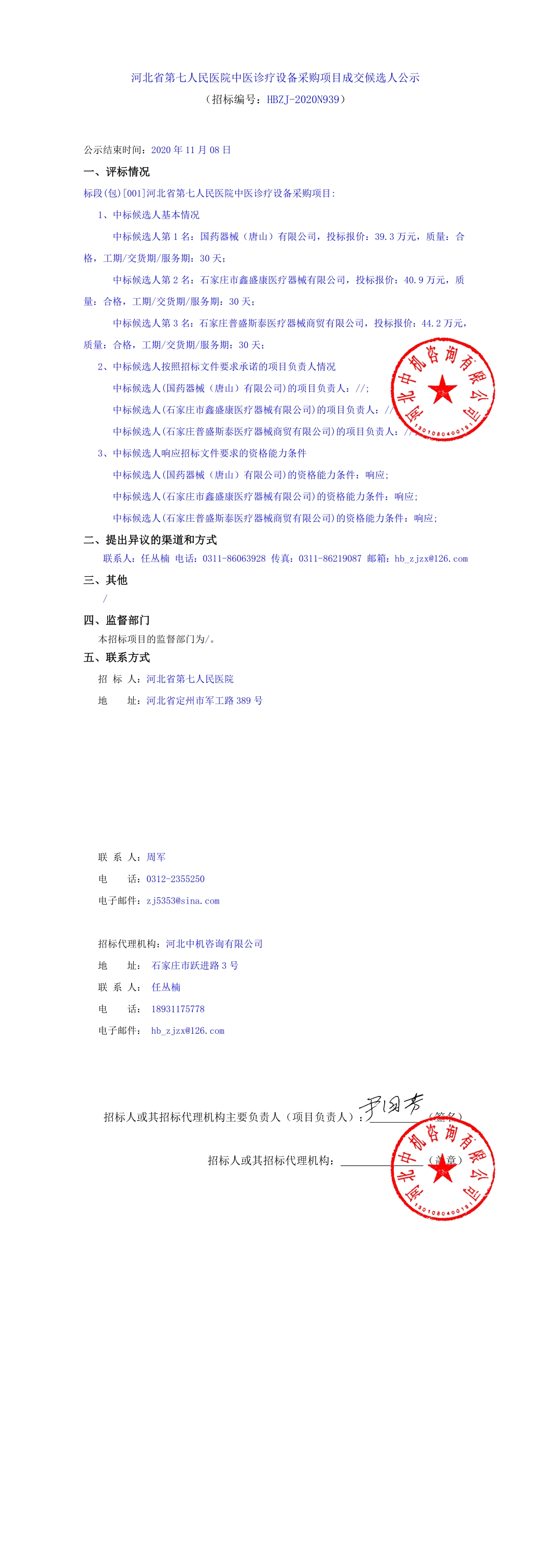 中医诊疗设备采购项目成交候选人公示