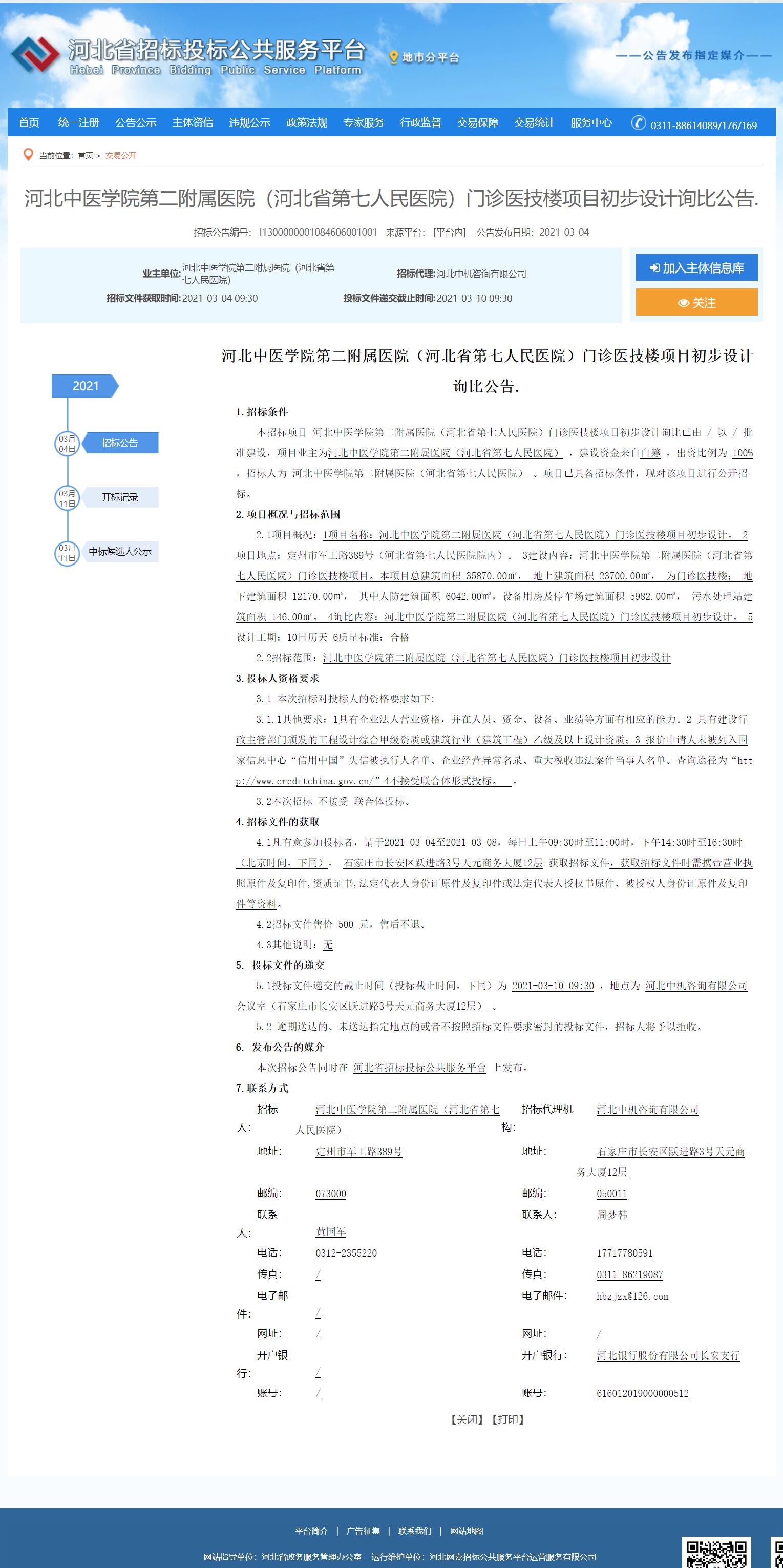 河北中医学院第二附属医院(河北省第七人民医院)门诊医技楼项目初步设计询比公告