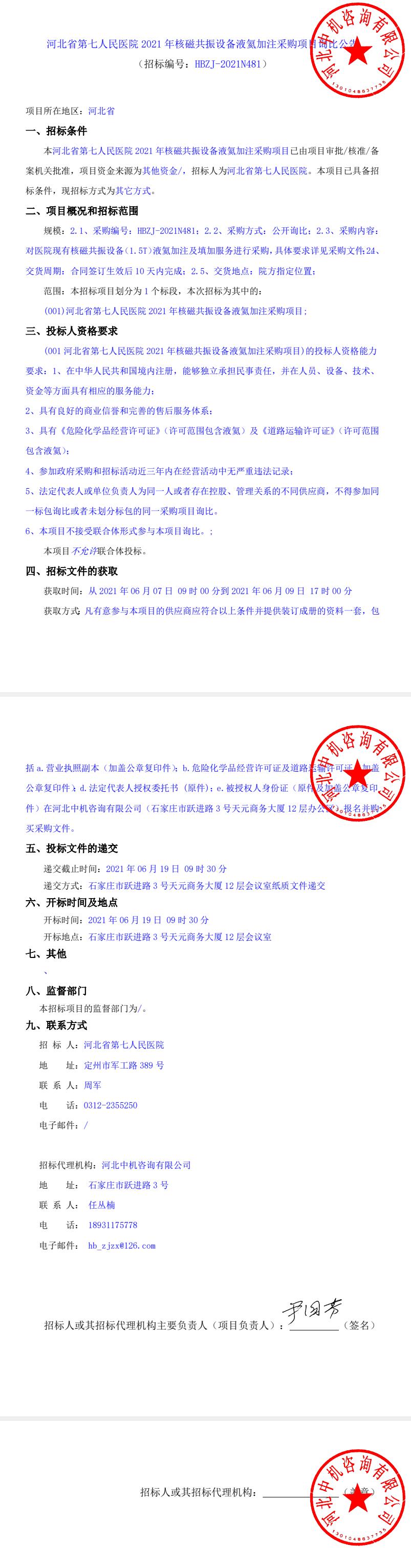 2021 年核磁共振设备液氦加注采购项目询比公告