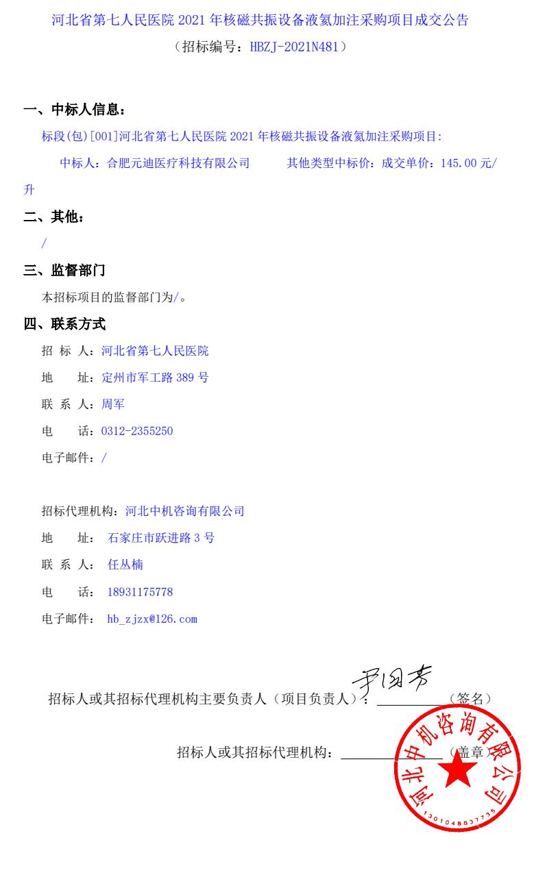 2021年核磁共振设备液氦加注采购项目成交公告