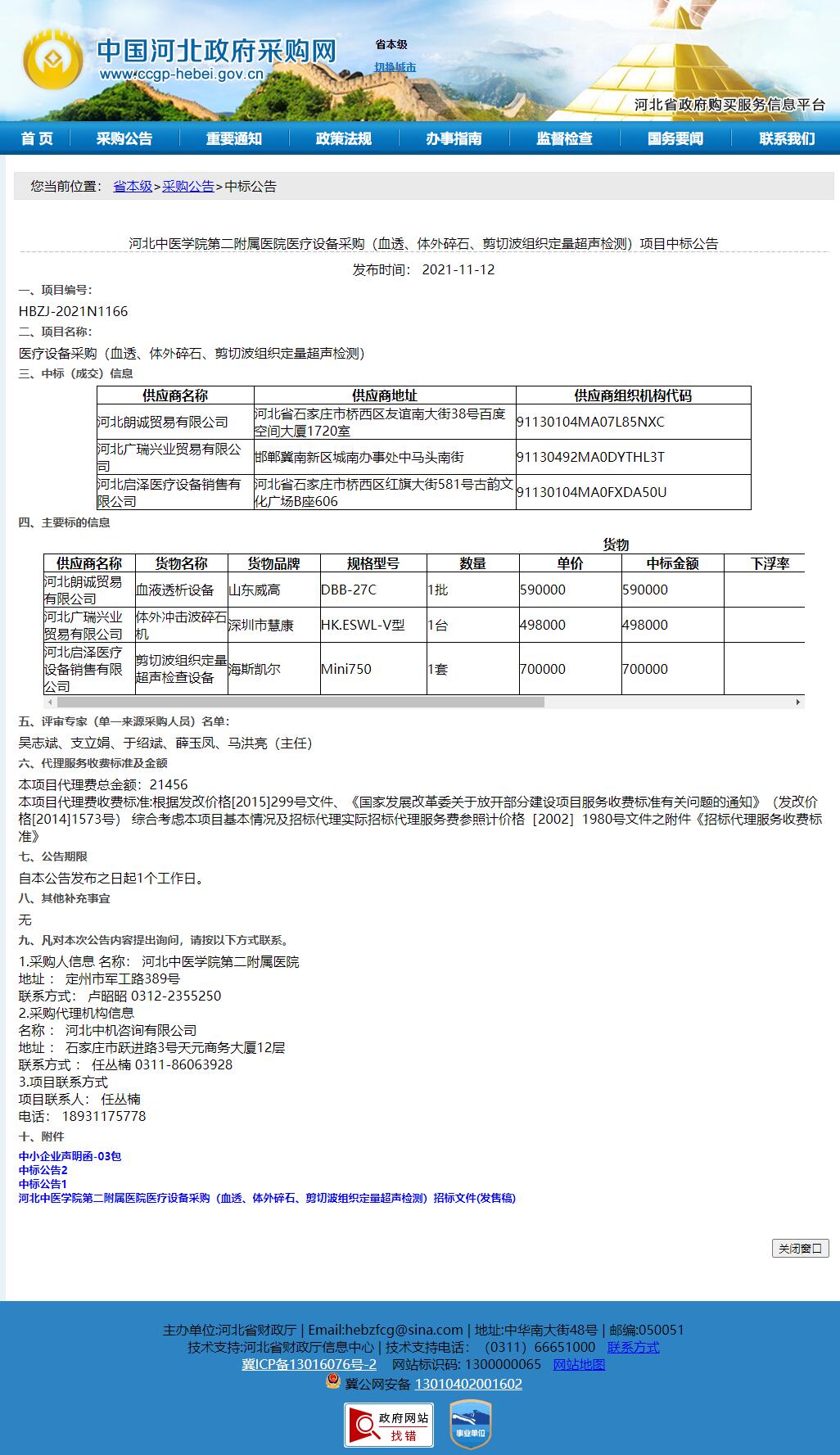 医疗设备采购(血透、体外碎石、剪切波组织定量超声监测)项目中标公告
