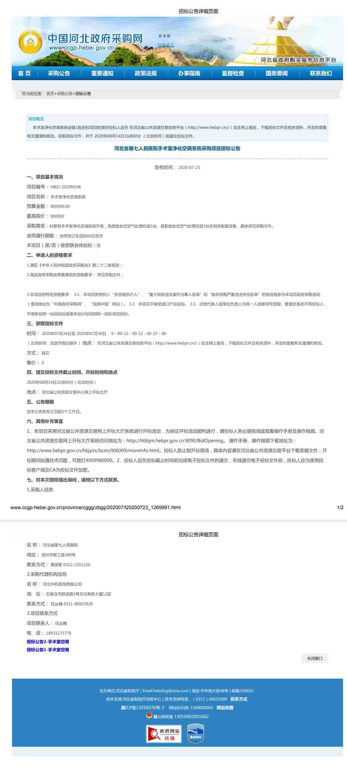 手术室净化空调系统采购项目招标公告