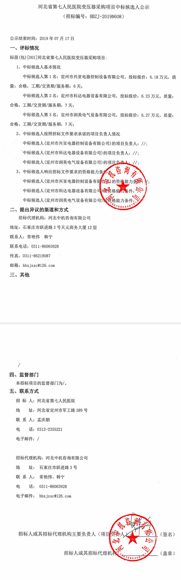 变压器采购项目中标候选人公示