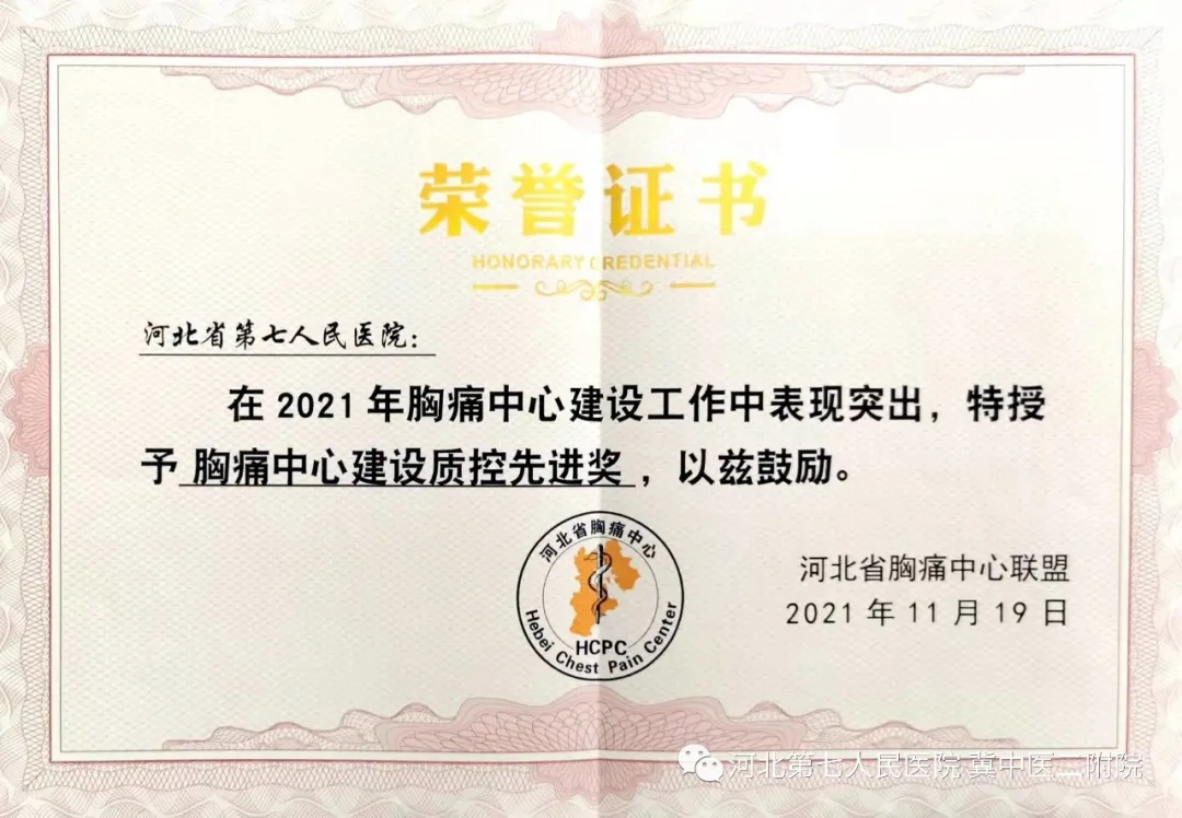11月19日,河北省胸痛中心联盟发布2021年表彰名单,河北省第七人民医院胸痛中心建设工作突出,荣获河北省“胸痛中心建设质控先进奖”。.jpg)
