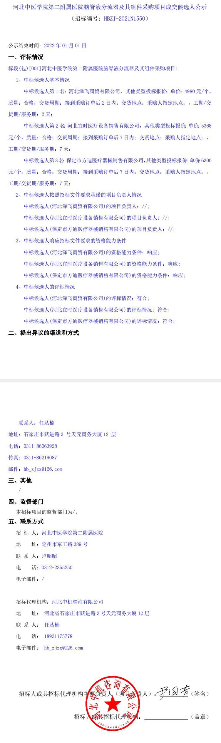 脑脊液分流器及其组件采购项目成交候选人公示