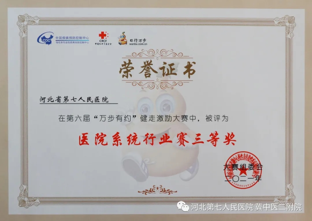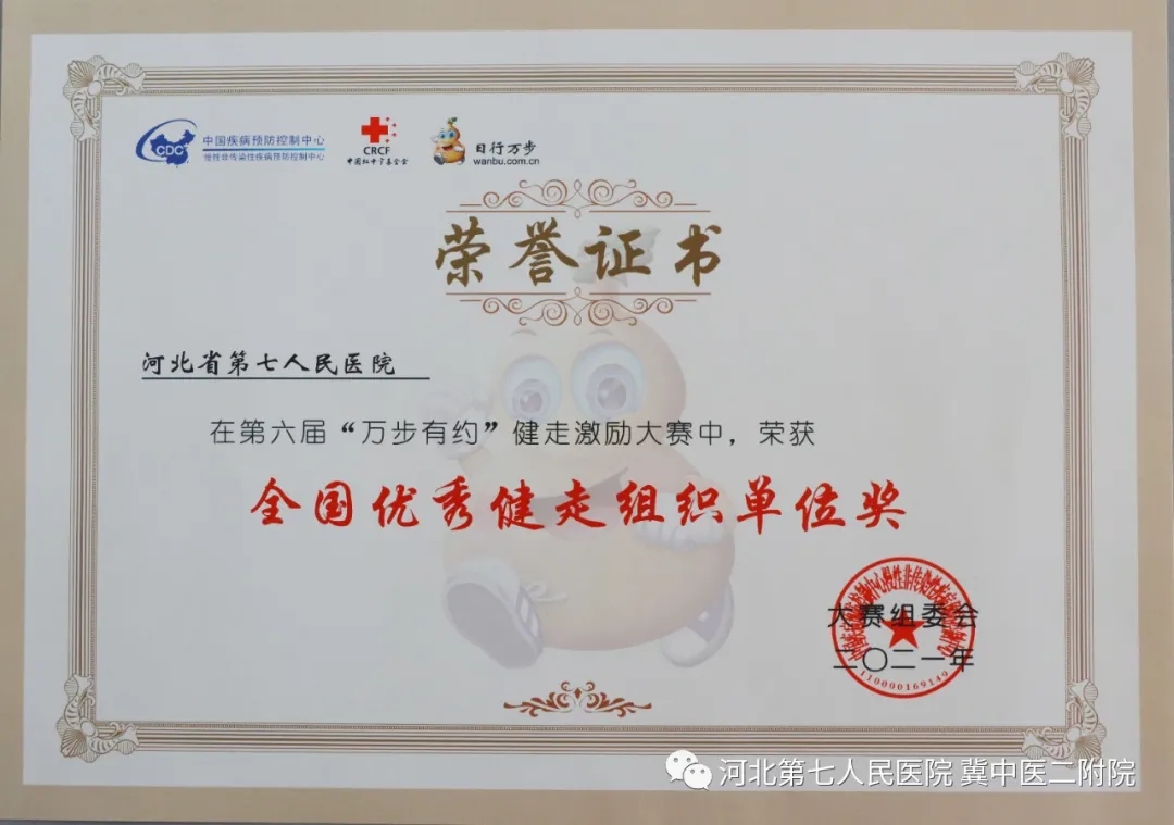 全国第六届“万步有约”健走激励大赛结果已于近期公布。河北省第七人民医院获“全国优秀健走组织单位奖”和“医院系统行业赛三等奖”两项殊荣。