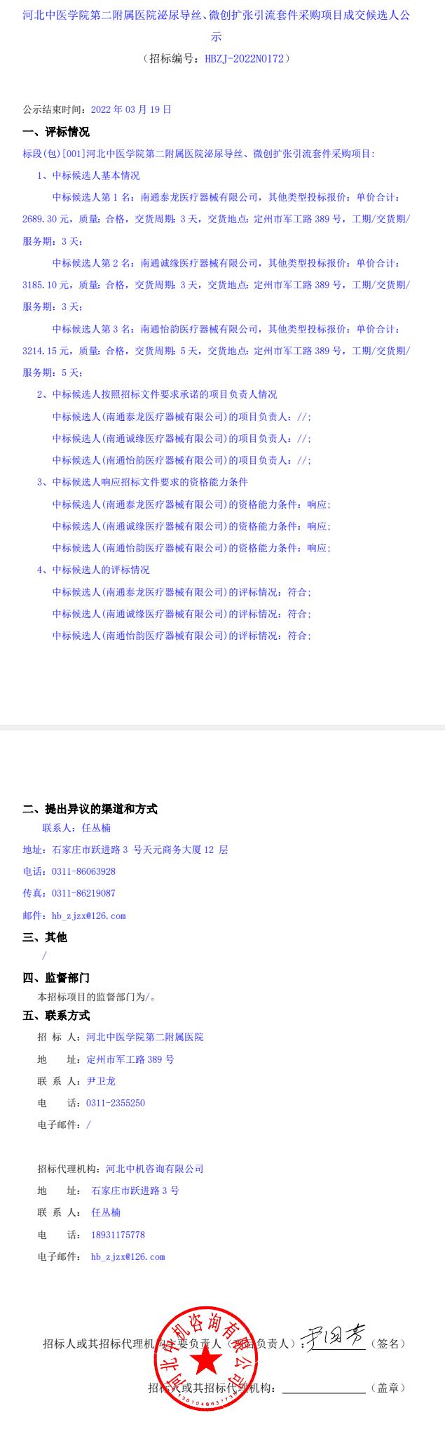 泌尿导丝、微创扩张引流套件采购项目成交候选人公示