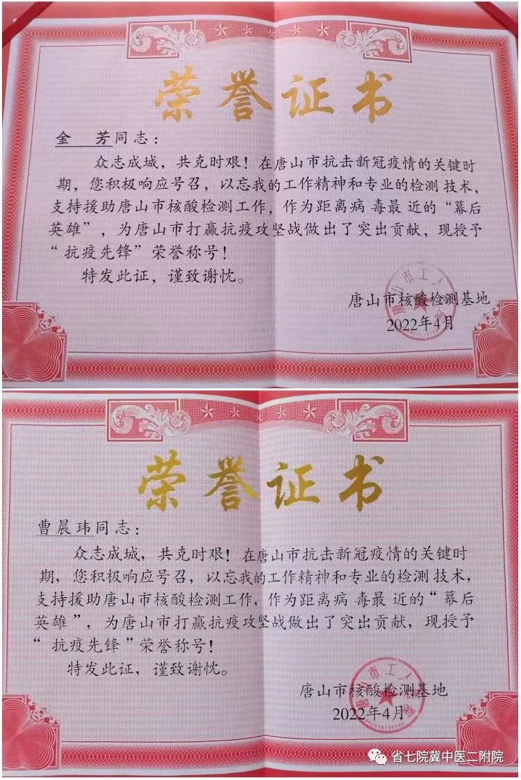 “众志成城,共克时艰!在唐山市抗击新冠疫情的关键时期,您积极响应号召,以忘我的工作精神和专业的检测技术,支持援助唐山市核酸检测工作,作为距离病毒最近的“幕后英雄”为唐山市打赢抗疫攻坚战做出了突出贡献,现授予“抗疫先锋”荣誉称号!”