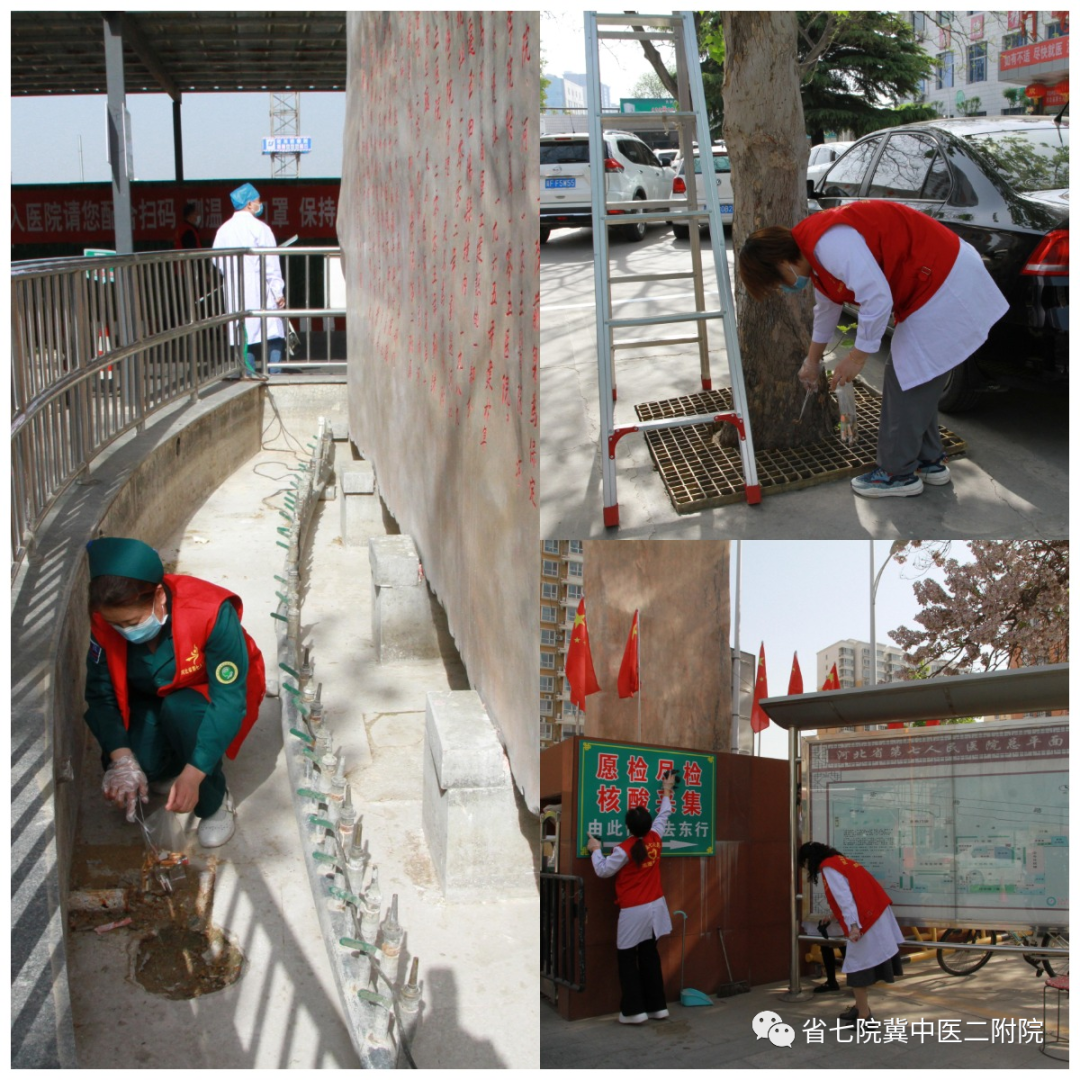 上午9:00,20多名志愿者穿着红马甲来到志愿楼前,各临床科室的职工们牺牲自己休息的时间前来参加活动,服务办韩瑞霞向大家介绍了本次活动的工作内容并进行了简单的任务分工,大家领取工具后,开始了清扫工作,医院院内随处可见热火朝天的劳动场面。