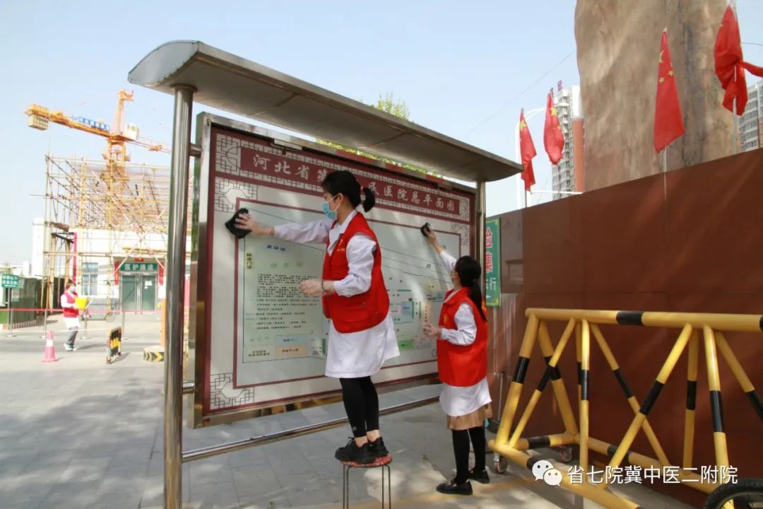 宣传处冯淑珍处长带领一波小美女们在擦拭院内的休闲椅、宣传栏;