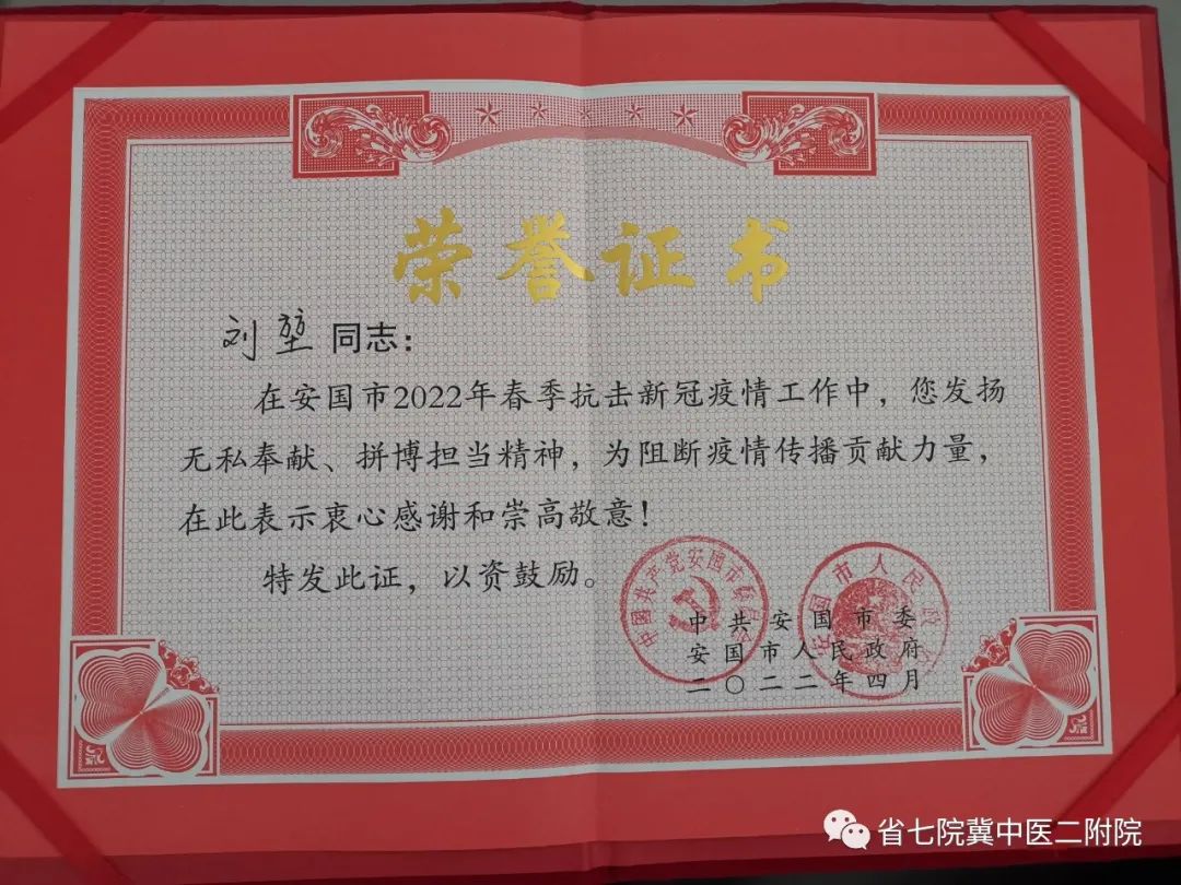 支援安国医务人员的荣誉证书到了