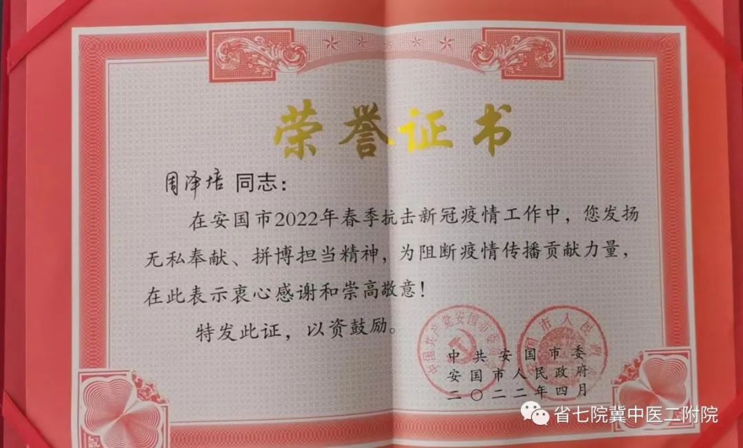 近日,我院支援安国疫情防控工作的刘堃和周泽培两位同志收到了来自中共安国市委、安国市人民政府颁发的荣誉证书,对两位同志在安国市2022年春季抗击新冠疫情工作中,发扬无私奉献、拼博担当精神,为阻断疫情传播贡献力量,表示了衷心感谢和崇高敬意!.jpg)