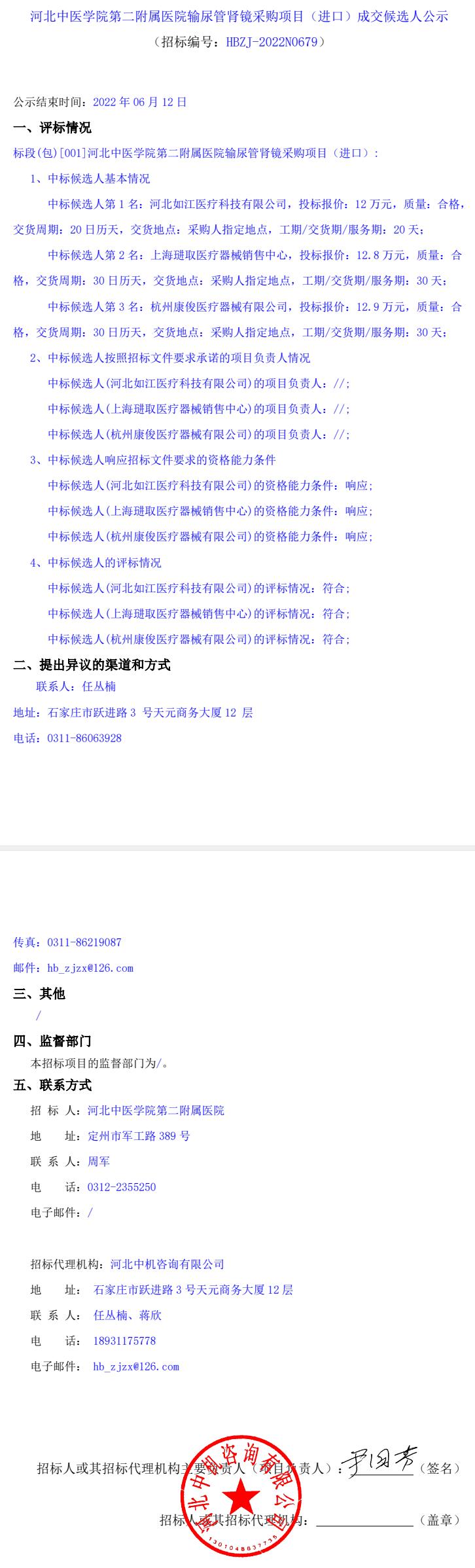 输尿管肾镜采购项目(进口)成交候选人公示