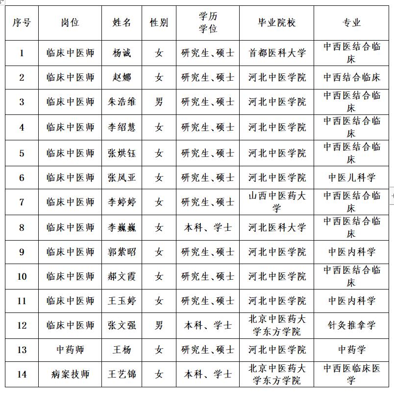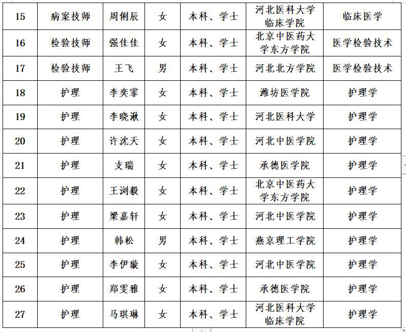 根据《河北省第七人民医院2022年招聘工作人员公告》,我院经过资格审查、理论考试、科级面试、院级面试等程序,经院党委会研究决定,根据学生报名情况调整录取岗位及部分岗位人员数量,拟聘用以下27人为我院工作人员,现予以公示。