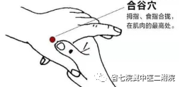 第三个是合谷穴,它在我们的第二掌骨中间桡侧。