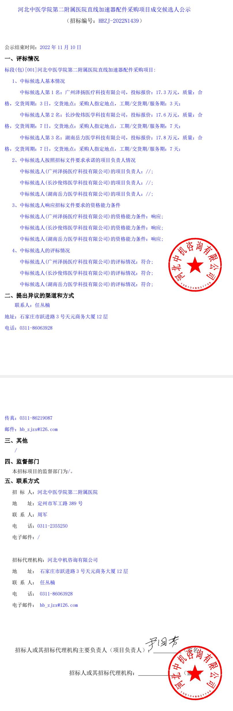 直线加速器配件采购项目成交候选人公示