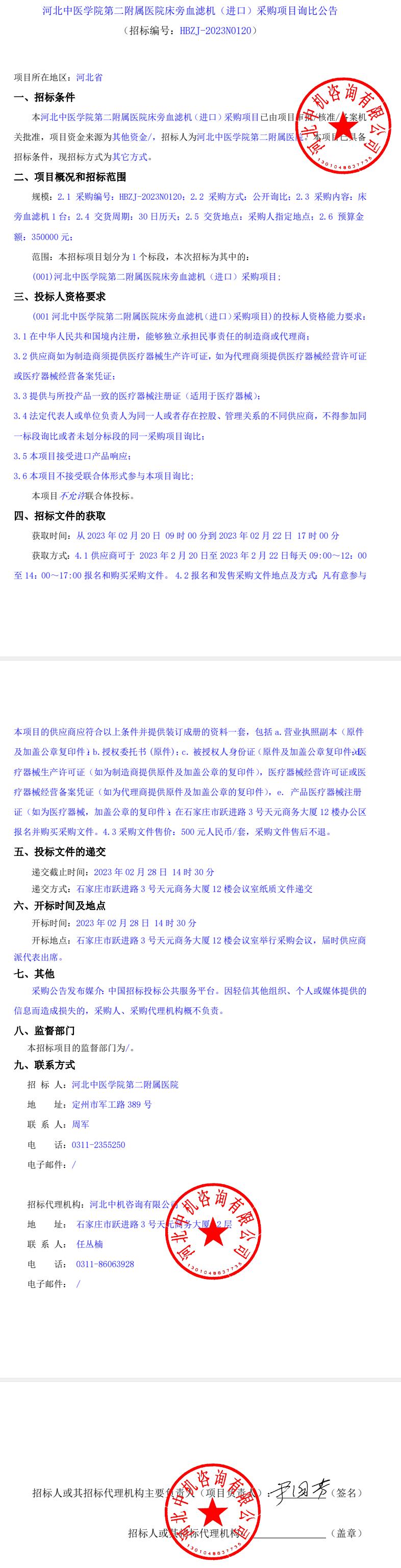 床旁血滤机(进口)采购项目询比公告