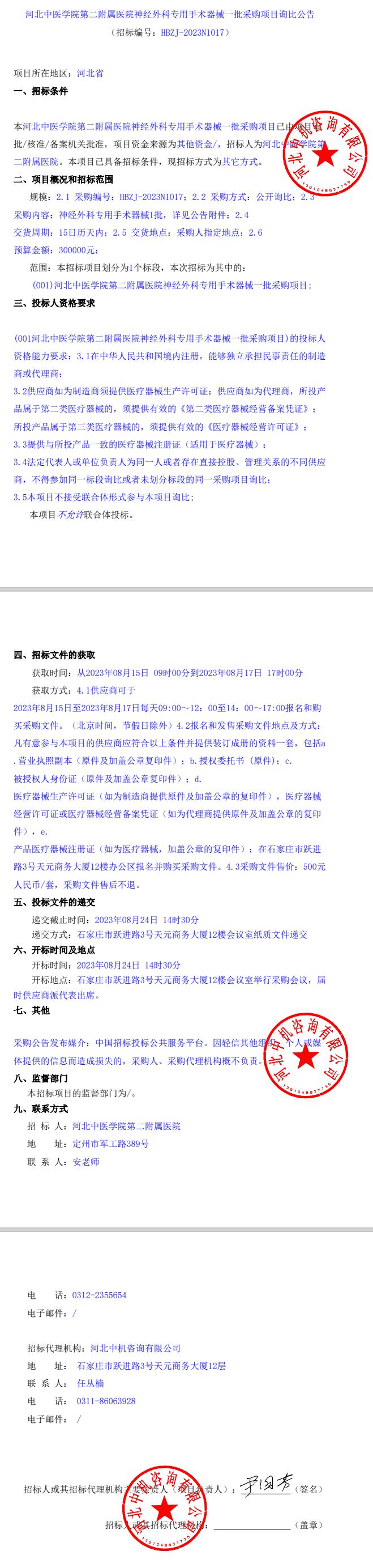 神经外科专用手术器械一批采购项目询比公告