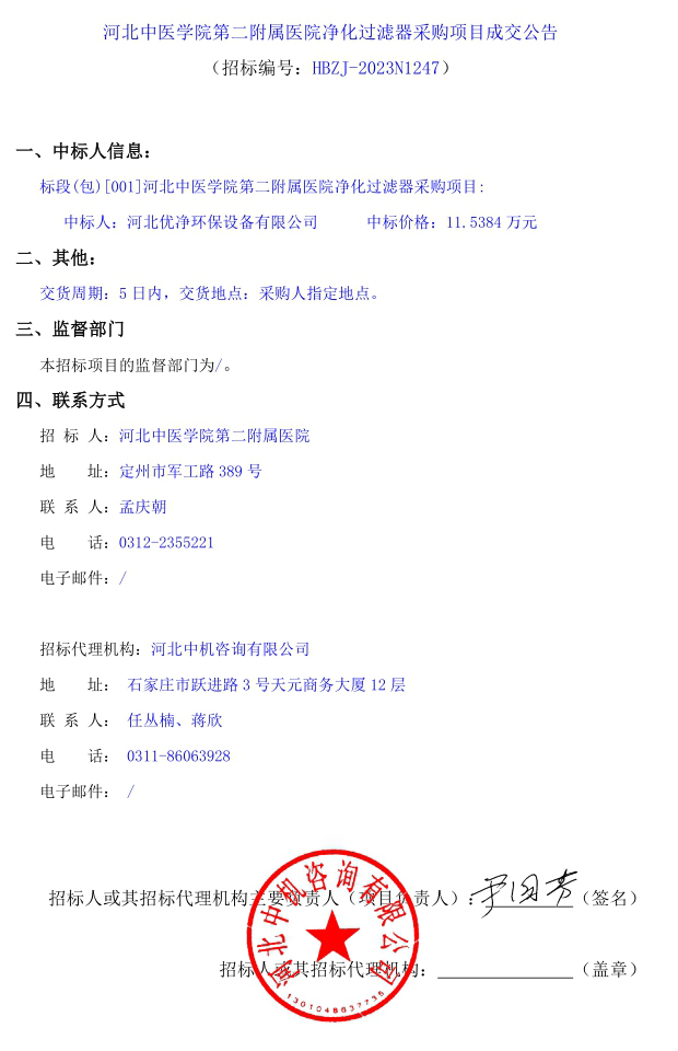 净化过滤器采购项目成交公告