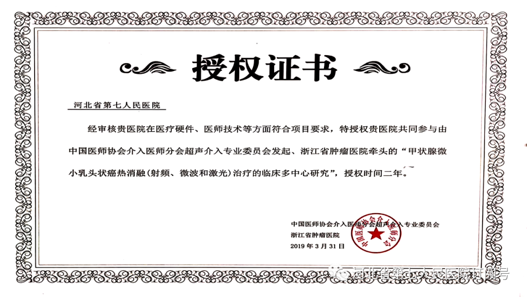 2、低危甲状腺微小癌热消融(射频、微波、激光)多中心研究分中心,是河北省唯一获此授权的单位。