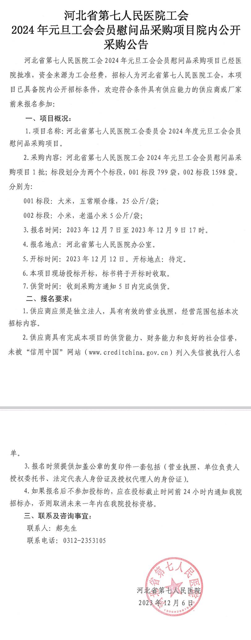 医院工会2024年元旦工会会员慰问品采购项目院内公开采购公告