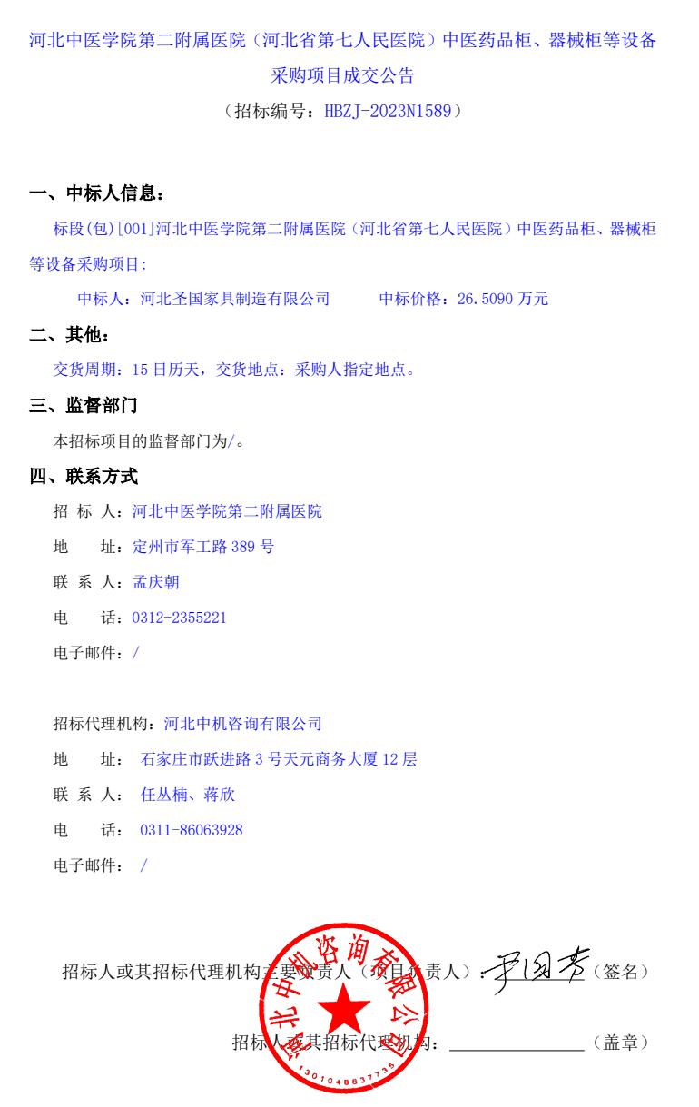 中医药品柜、器械柜等设备采购项目成交公告