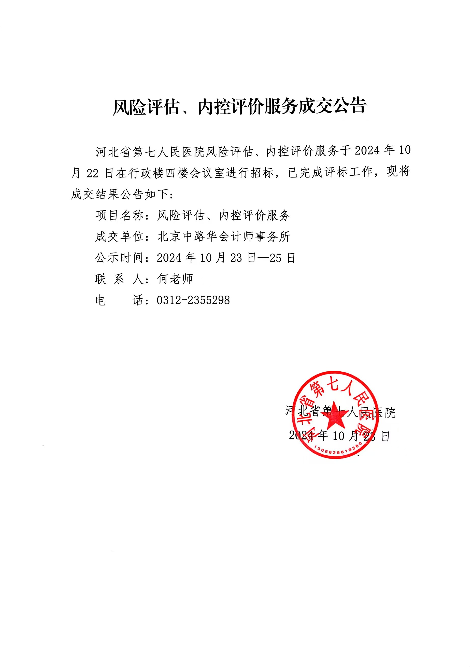 风险评估、内控评价服务成交公告