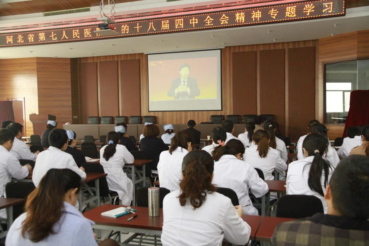 11月26日,省七院召开十八届四中全会精神专题学习会,学习会由医院党办室主任刘永刚主持,党委书记安树章发表重要讲话,全体党员参加学习。