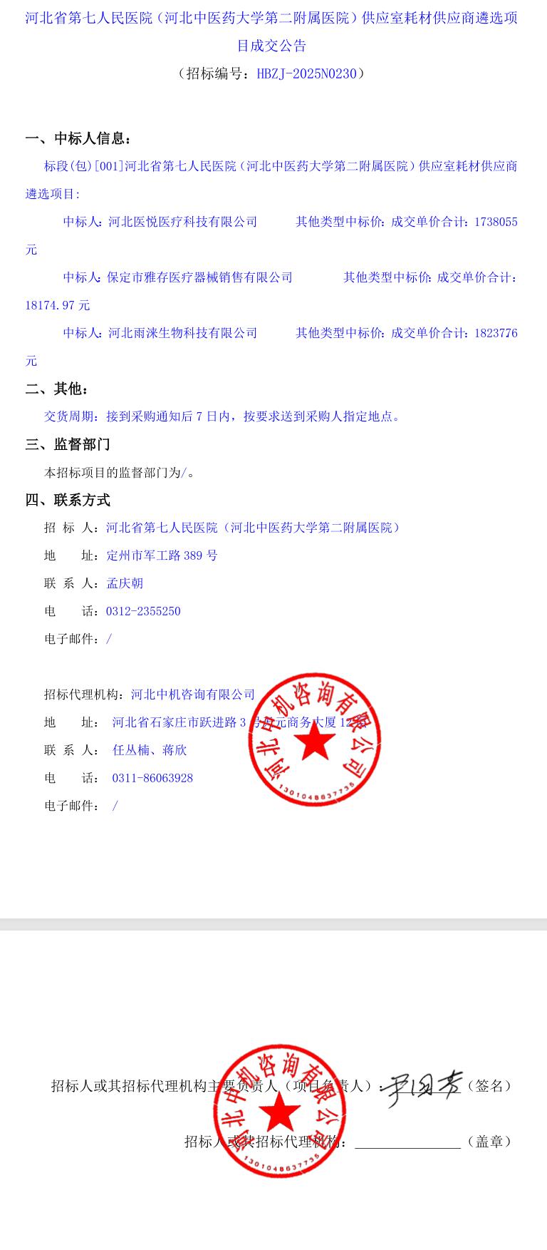 供应室耗材供应商遴选项目成交公告