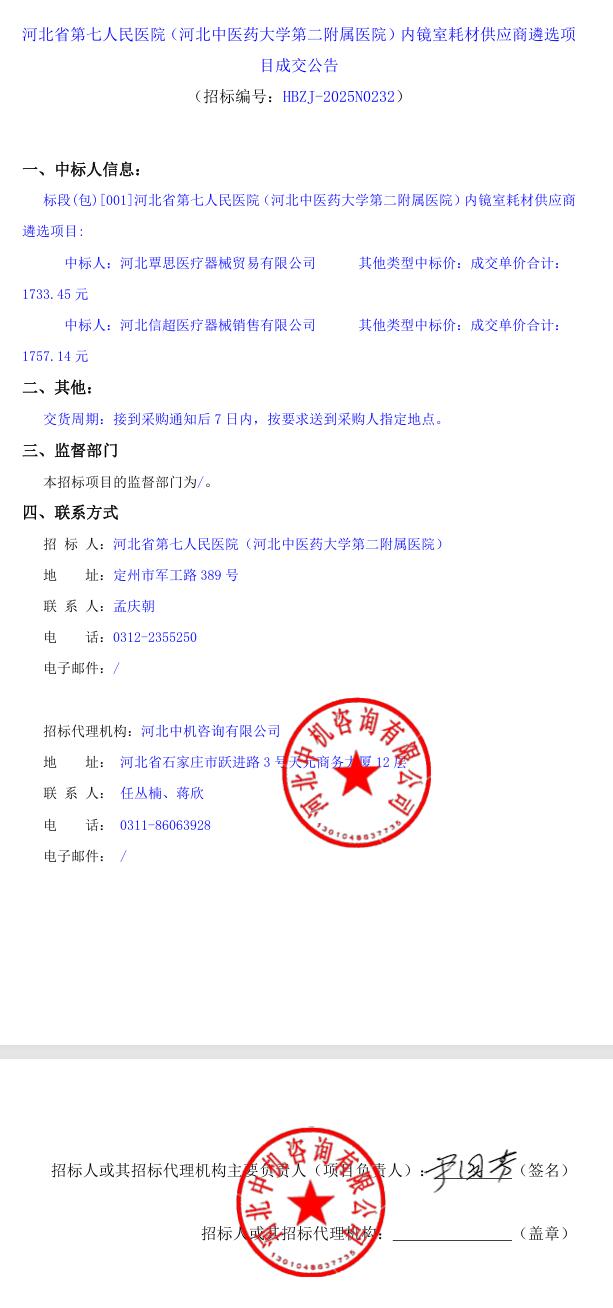 内镜室耗材供应商遴选项目成交公告