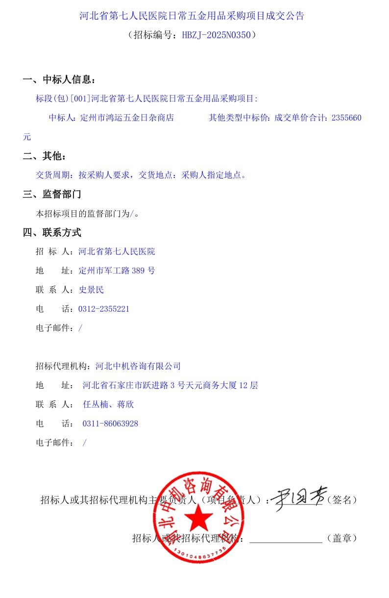 日常五金用品采购项目成交公告