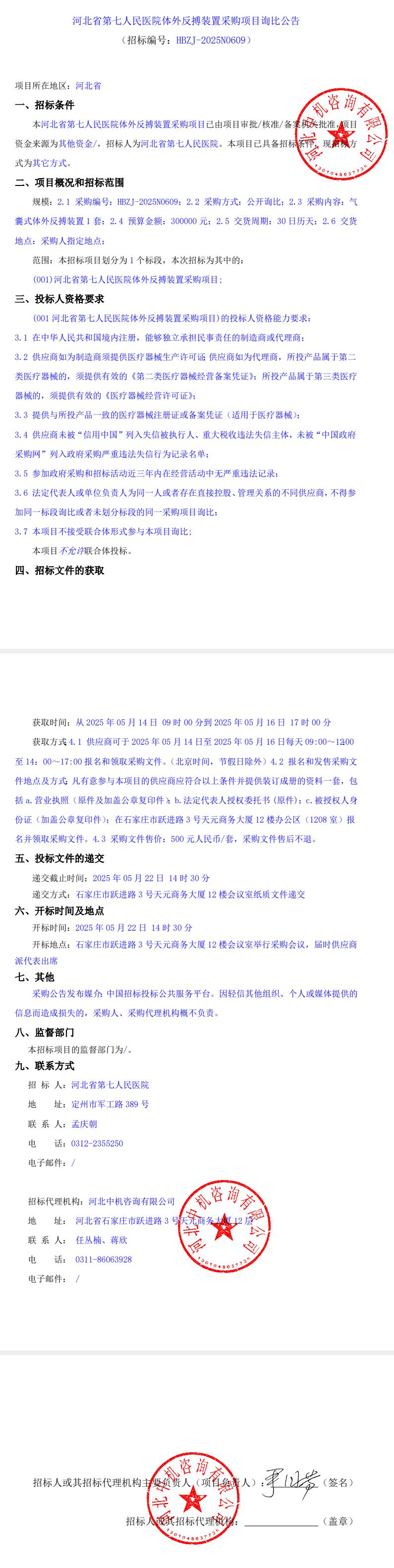体外反搏装置采购项目询比公告