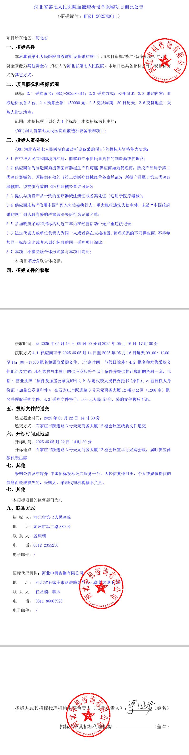 血液透析设备采购项目询比公告