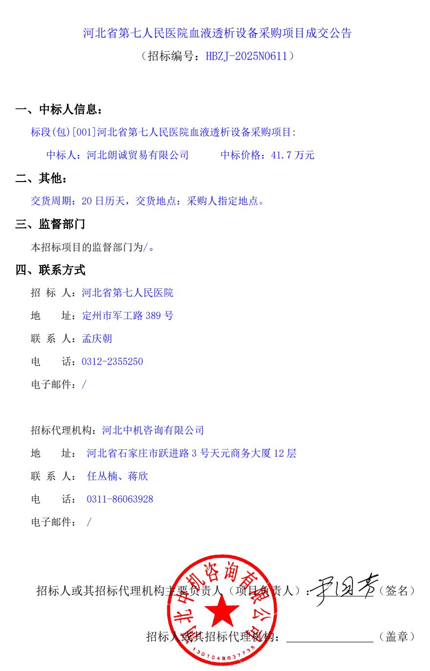 血液透析设备采购项目成交公告