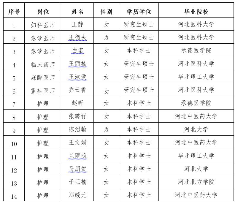 根据《河北省第七人民医院2025年招聘工作人员公告(非在编)》,我院经过资格审查、理论考试、面试、体检、考察等程序,拟聘用以下14人为我院工作人员,现予以公示。