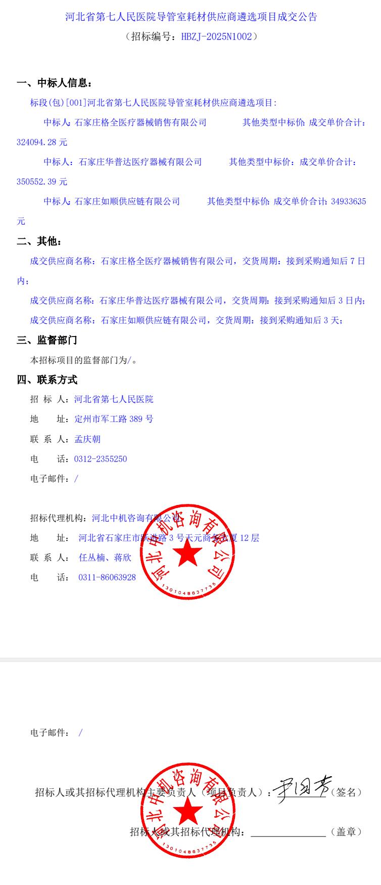 导管室耗材供应商遴选项目成交公告