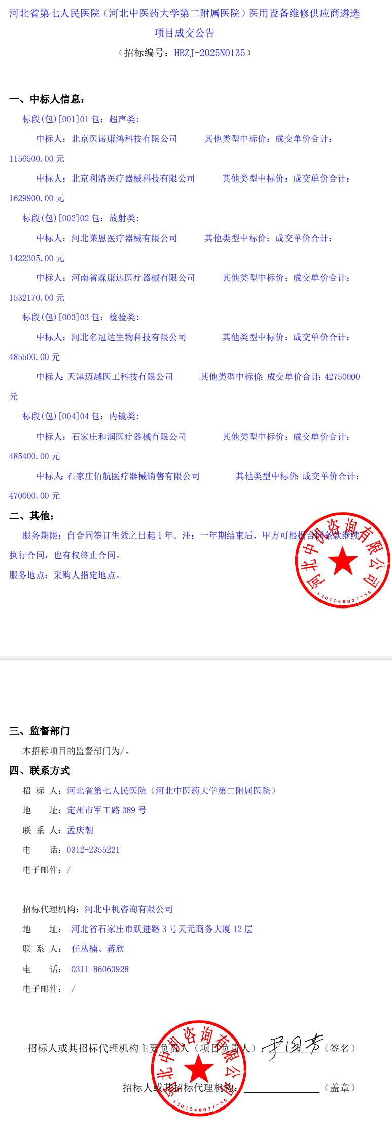 医用设备维修供应商遴选项目成交公告