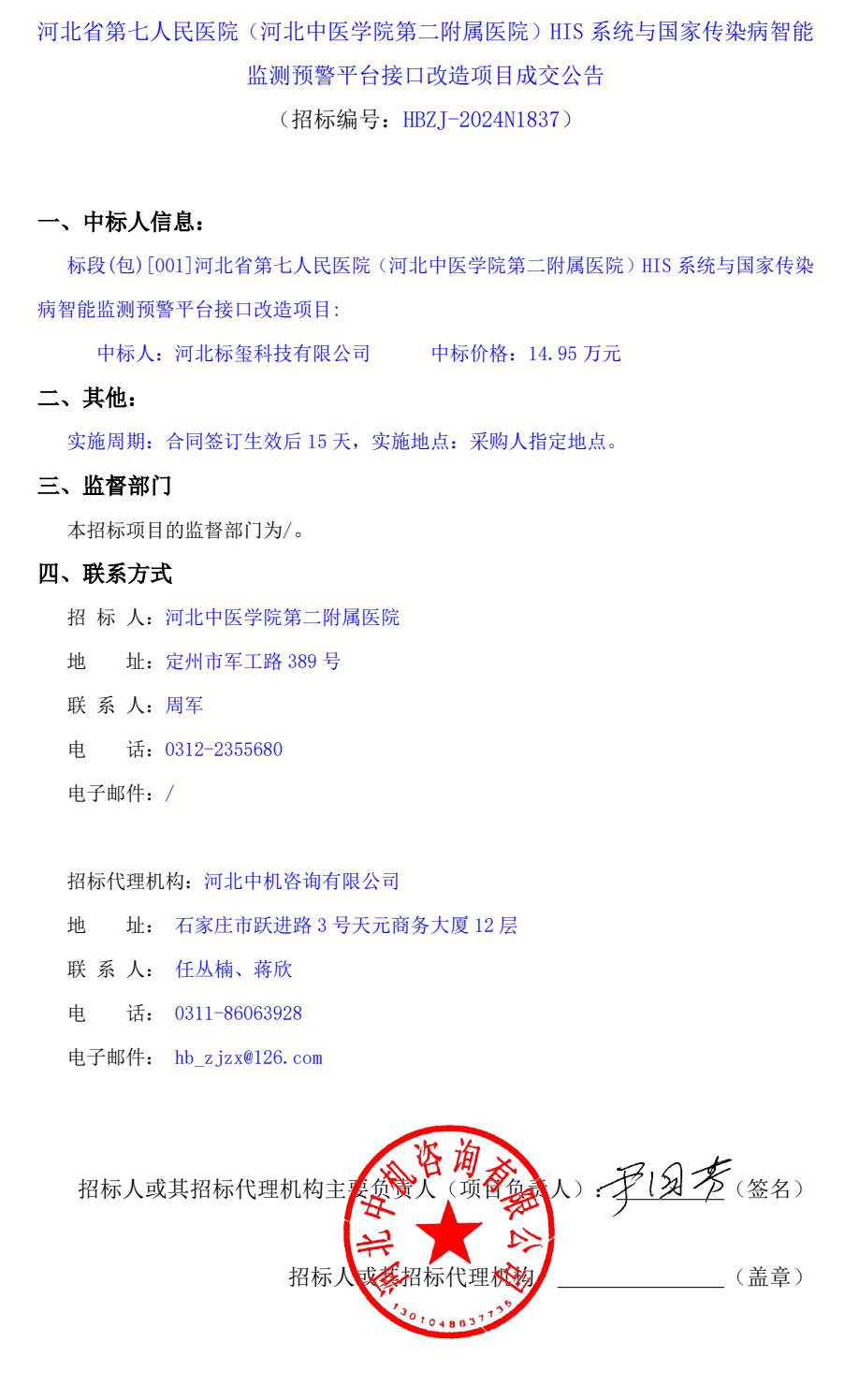 HIS系统与国家传染病智能监测预警平台接口改造项目成交公告