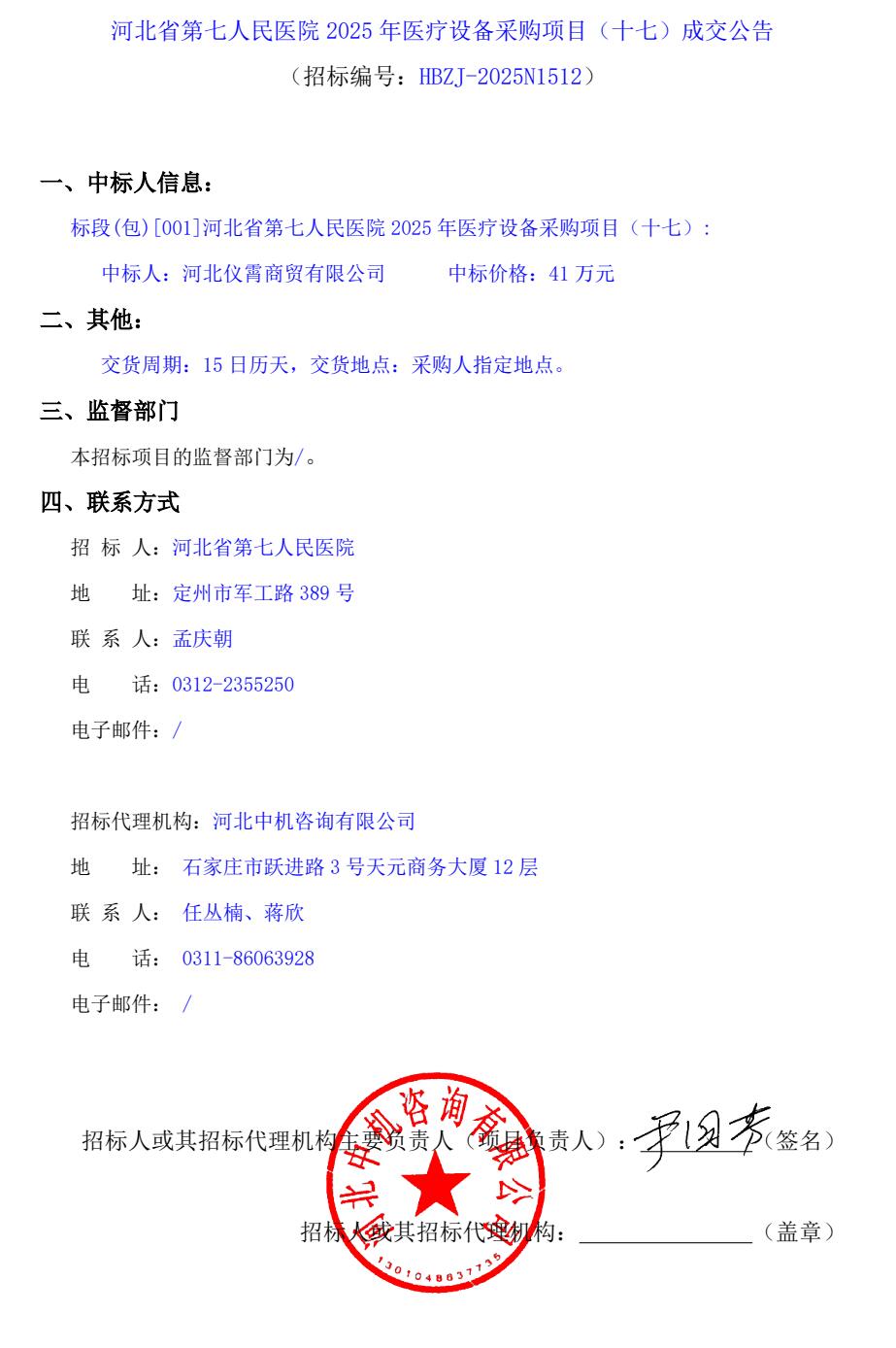 2025年医疗设备采购项目(十七)成交公告
