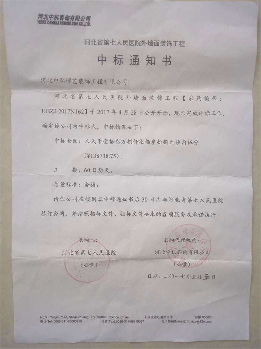 外墙面装饰工程中标通知书