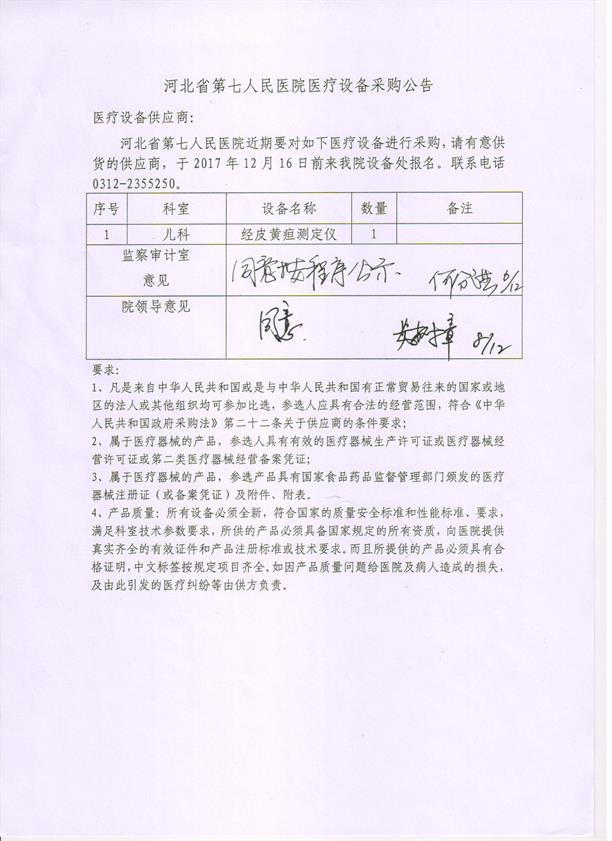 河北省第七人民医院经皮黄疸测定仪采购公告